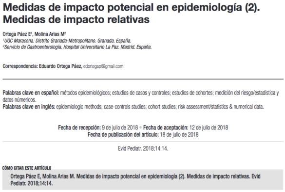 En este artículo nos hablan de las medidas de impacto relativas, que son aquellas que miden el porcentaje de riesgo que es debido a la exposición y además de los números de impacto potenciales cuando pretendemos cuantificar el número de personas que están en riesgo o presentan el evento de...