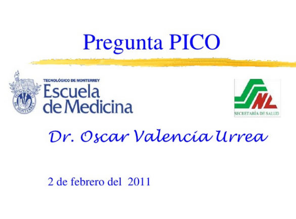 En la siguiente presentación de diapositivas, elaborada por Óscar Valencia y publicada en el canal de Slideshare de Carlos Cuello, se muestra un ejemplo de construcción de una pregunta PICO a partir de un escenario clínico y plantea 3 escenarios más sin resolver para que practiques. Pregunta pico de...