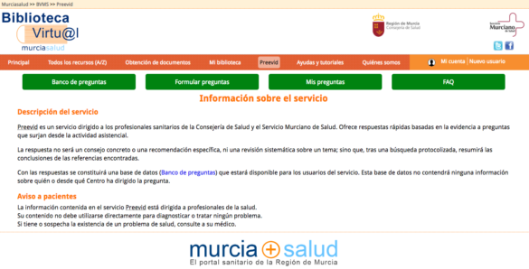 Preevid es una web, desarrollada por el Servicio Murciano de Salud, dirigida a profesionales sanitarios de la de la Consejería de Salud y el Servicio Murciano de Salud. Ofrece respuestas rápidas basadas en la evidencia a preguntas que surjan desde la actividad asistencial. La respuesta que se facilitan no son...